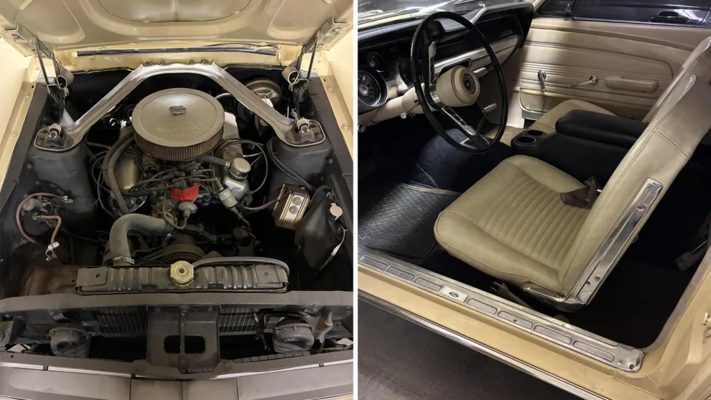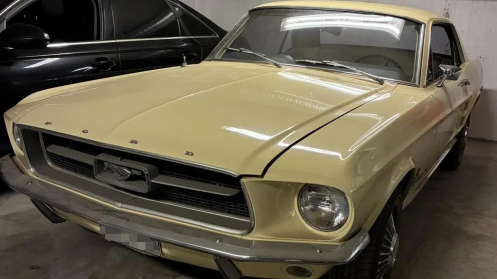 Samma mönster återkommer hos den andra Mustangen som säljs samtidigt. Det är en ljusgul Ford Mustang från 1967. Även den är obesiktigad sedan länge, närmare bestämt sedan 2009 och även här saknas nycklar. Bilen har automatlåda, bensinmotor och skinnklädsel men har inte startats eller funktionstestats inför försäljningen.