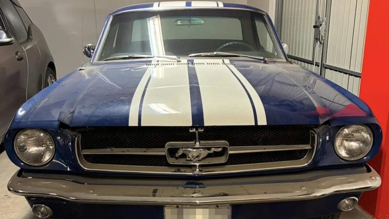 Den första bilen som väcker uppmärksamhet är en blå Ford Mustang från 1965. En klassisk årsmodell med rätt formspråk och rätt känsla. Bilen registrerades första gången samma år som modellen lanserades och kom till Sverige 2006. Sedan dess har den blivit stående. Den har inte varit besiktigad sedan 2008 och inför auktionen har den varken startats eller funktionstestats.