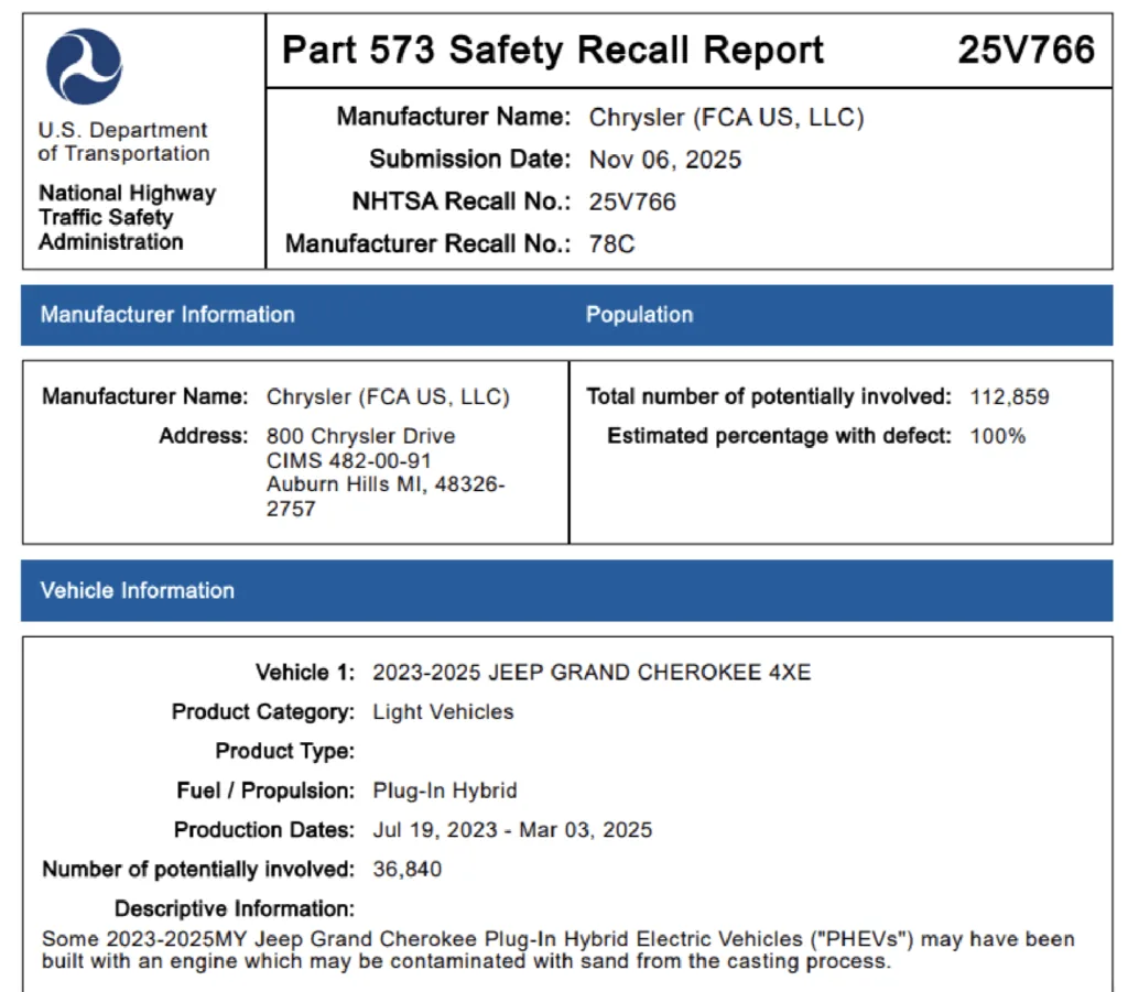 Problemen har redan orsakat 144 garantiärenden, 36 bränder, 50 rapporter om framdrivningsbortfall och 50 andra servicerapporter som potentiellt kan relatera till detta problem för alla marknader, uppger NHTSA. Flera bilar har också skadats av felet, men några olyckor har inte skett. Sammantaget återkallas 36 840 Grand Cherokee 4xe och 76 019 Wrangler 4xe under modellåren 2024 och 2025. När felet inträffar hörs ett knackande ljud från motorn och en varningslampa kan tändas i instrumentpanelen.