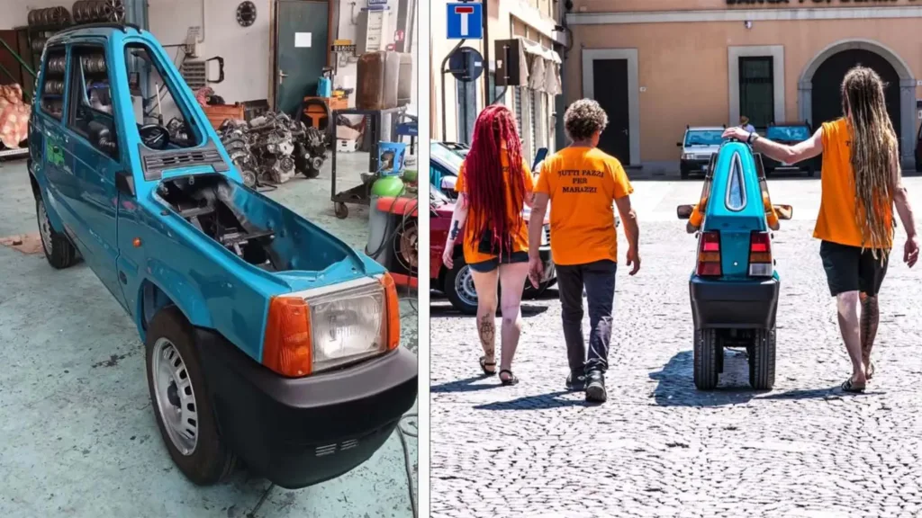 Bilen är bara 49,5 cm bred. Det innebär att den har krympt till nästan en tredjedel av sin ursprungliga bredd, på 146 centimeter. För att få plats i den extremt smala kupén har Marazzi behövt tänka om helt kring mekaniken. Bilen har nu bara en sittplats, och bensinmotorn har fått ge vika för en elektrisk motor från en skoter. Bygget baseras på en Fiat Panda från 1993, men under skalet är det mesta utbytt.