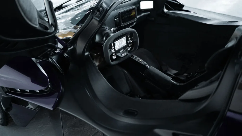 Modellen är extremt sällsynt. Hardtop-versionen gjordes i 150 exemplar, men vill man ha en Spider, då äger man en av bara 85. En av dem tillhör Alejandro Roemmers – en ytterst specialdesignad bil. Och färgen är bara början. När han designade sin Valkyrie såg han till att bilen fick exponerad kolfiber på takpanelerna, motorlocket, vindrutetorkarens fäste och stora delar av underredet. För kolfibern betalade Roemmers 562 000 kronor, och ytterligare en halv miljoner kronor gick till de mattsvarta aluminiumsfälgarna. Sedan har vi kupén…