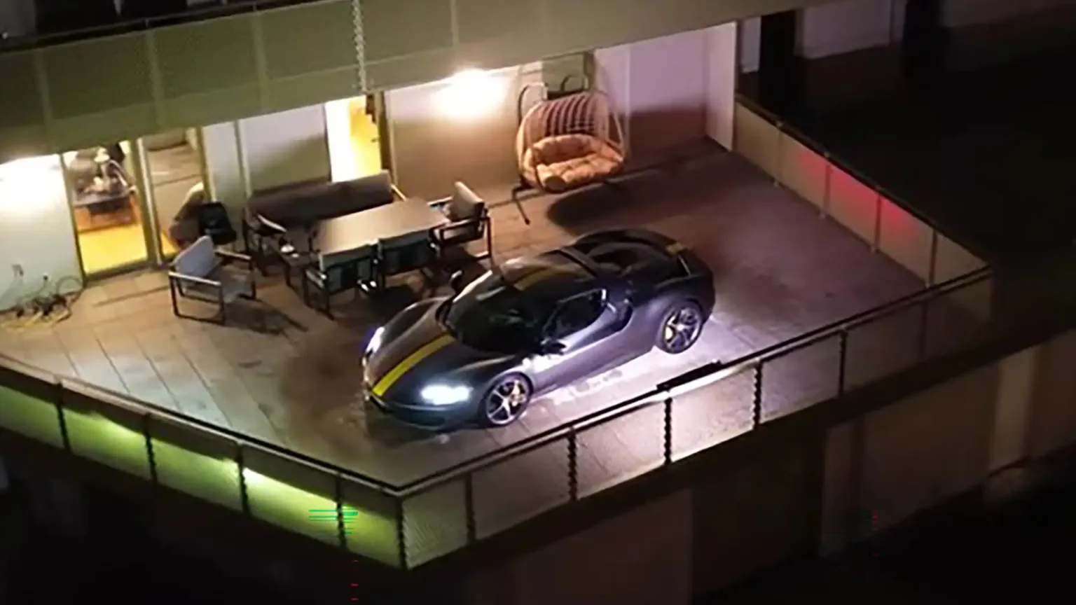 Han parkerade sin Ferrari på balkongen. Videon visar en kran som lyfter upp 28-åringens lyxbil. Men nu har myndigheter ingripit – och situationen tog en helt ny vändning.