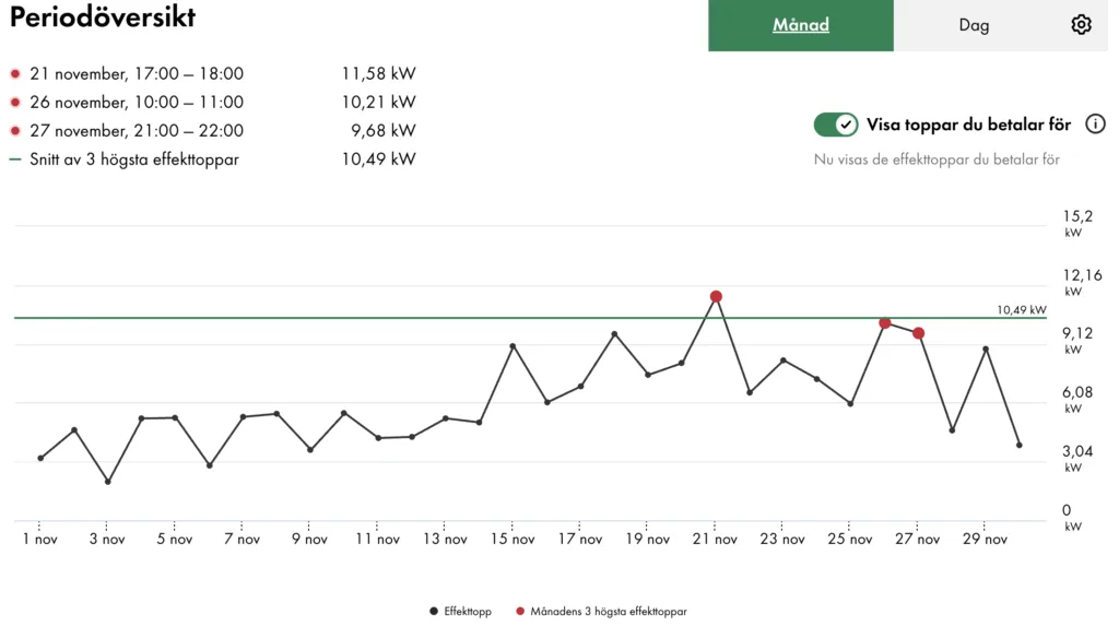 | Vad mäts? | Din högsta timmeffekttopp under en period — dvs. när flera elförbrukande apparater är igång samtidigt (till exempel elbil, värme spis + tvätt) |