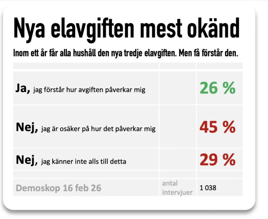 Snart får alla svenskar den tredje stora elavgiften. Senast den första januari 2027 ska alla energibolag i Sverige ha infört effekttariffer. Men nu visar en opinionsundersökning från energiekonomen Claes Hemberg att endast en av fyra förstår hur den påverkar deras ekonomi.