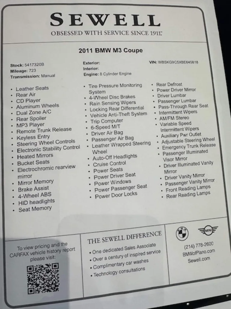 Bilen upptäcktes av en slump av Frank, forummedlem på BMW Blog, när han skulle hämta sin egen bil från service. På parkeringen stod en svart M3 Coupé med manuell växellåda. När han tittade på prislappen i rutan trodde han först att mätarställningen på 723 miles (motsvarande 116 mil) var ett tryckfel. Men det var ingen felskrivning.