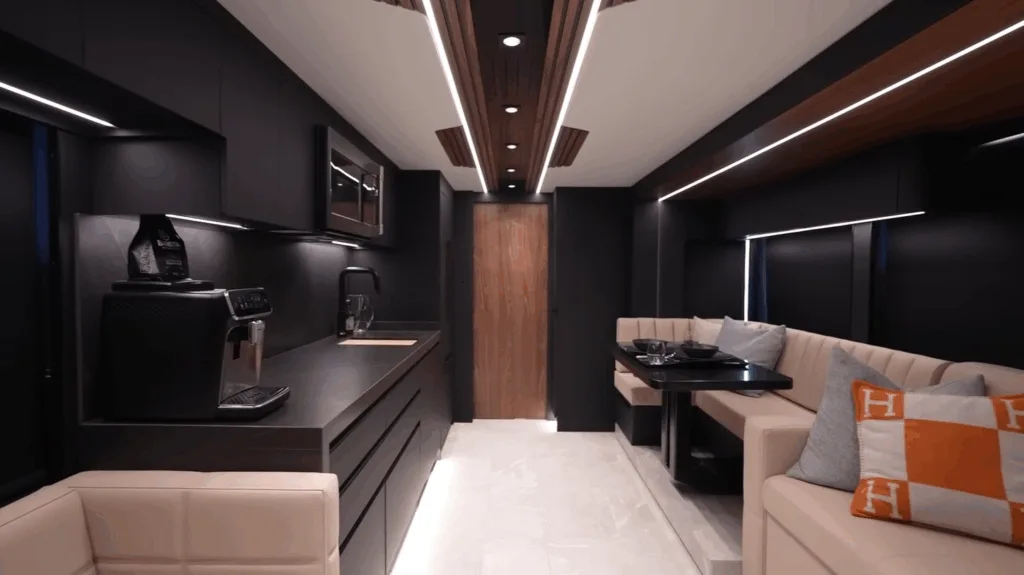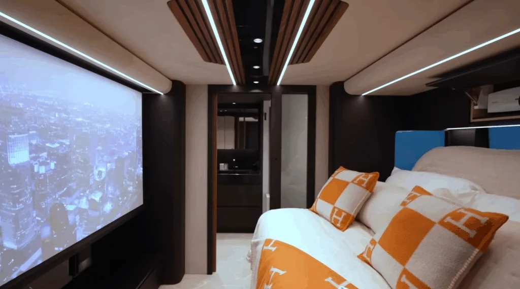 Husbilen har plats för upp till sex personer i tre separata sovområden. Men det mest unika är att husbilen har sängar som automatiskt bäddas med ett knapptryck. Precis som Musse Piggs och Långbens husvagn på julafton i ”Kalle Anka och hans vänner”.