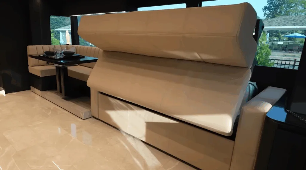 Om man vill slippa insyn går naturligtvis även det att lösa. Fönstren i sovrummet och badrummet kan frostas med ett så kallat elektrokrómiskt glas. Och i vardagsrummet finns en soffa som kan fällas ihop… med ett knapptryck. Nästan allt ombord styrs enkelt med ett knapptryck eller via surfplattan.