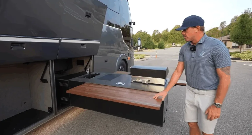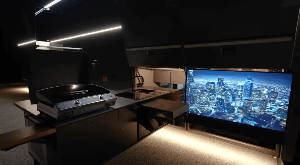 Och på campingsidan finns också skarp teknik. Det finns bland annat ett utomhuskök. Medan man lagar mat finns underhållning, tack vare en utdragbara TV:n och mycket annat.