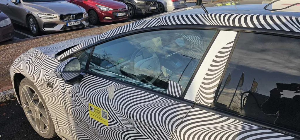 Elbilen Xpeng P7+ fångad under tester i Sverige. Hemlighetsmakeriet är stort, trots att bilen redan visats. Foto: René Flap Hansen