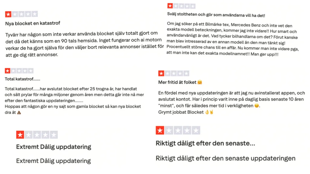 Missnöjet har vuxit i flera veckor och syns överallt på bland annat Facebook, i kommentarsfält, i App Store och på Trustpilot där negativa omdömen strömmar in dagligen. Många beskriver det nya gränssnittet som rörigt och långsamt, medan andra tycker att viktiga funktioner försvunnit. Kritiken har varit så omfattande att köpare och säljare nu startat en protestgrupp på Facebook.