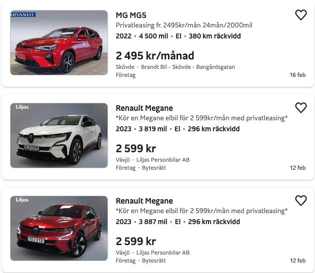 Marknaden sväller just nu över av erbjudanden om att privatleasa begagnade elbilar. Till exempel lockas kunder med en Volkswagen ID.4 från 2023 för 3 600 kronor i månaden samtidigt som en helt ny kostar cirka 5 500 kronor i månaden. En Renault Megane E-Tech från samma år går att få för omkring 2 600 kronor i månaden. Men det som ser billigt ut i annonsen kan bli betydligt dyrare i verkligheten.