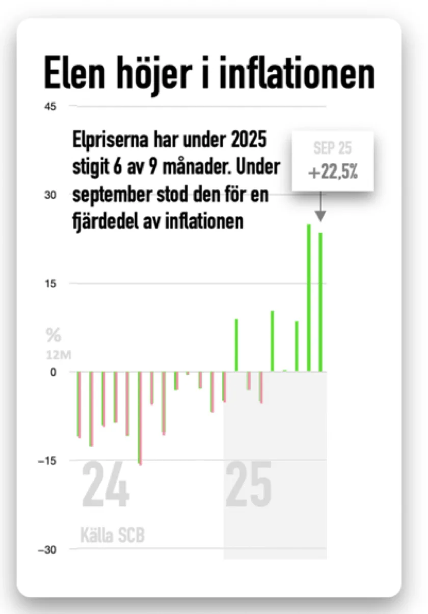 – Bara den senaste månaden, september, har elpriserna stigit med hela 22 % jämfört med i fjol. Då motsvarade elprisernas uppgång mer än en fjärdedel, eller 0,7 procentenheter, av hela inflationen på 3,2 %. Priserna steg i skuggan av att flera reaktorer var på reparation och vi hade lite blåst i vindkraften, säger Claes Hemberg.