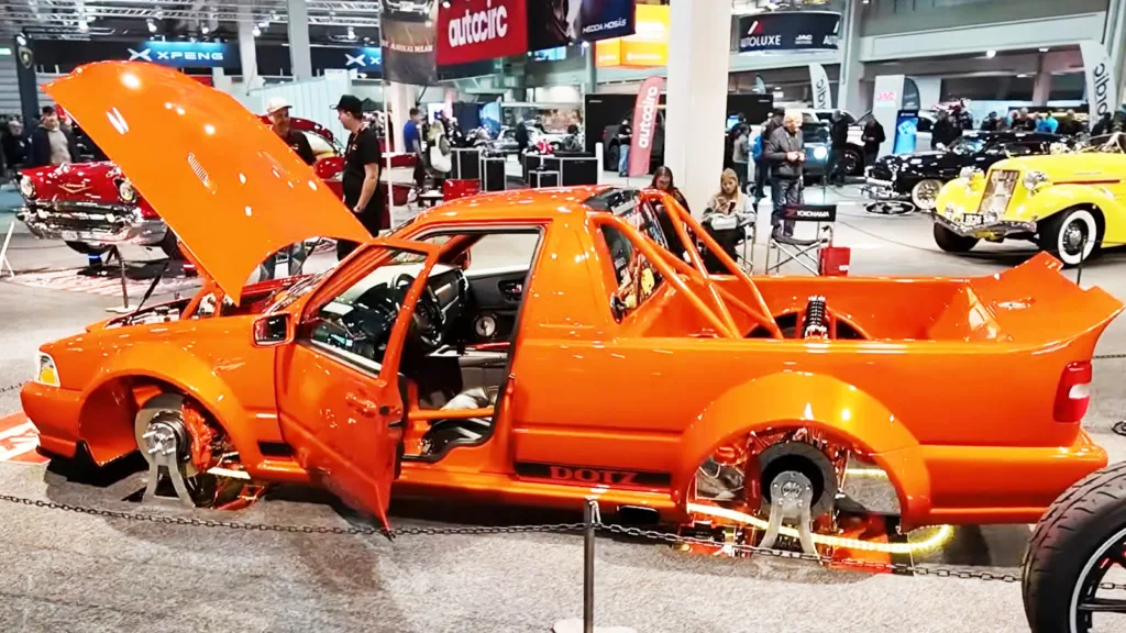Även inne i bilen har mycket byggts om. Markus berättar att bilen bland annat fått inredning från en Volvo V90. Samtidigt syns det tydligt att fokus inte bara legat på att få bilen att sticka ut. Det handlar också om ett omfattande hantverk, från plåtbreddningar till egenbyggda lösningar i flaket och runt bakvagnen. Trots att han jobbar som bilmekaniker på Mercedes har mycket av karossarbetet varit självlärt.