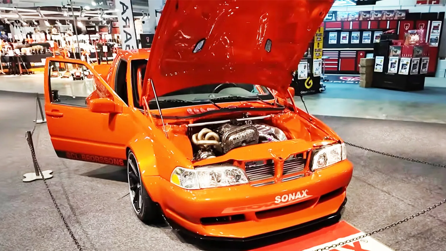 Bakom det orangea showbygget döljer sig också en ovanlig teknisk mix. Enligt Markus sitter det en Mercedes-bakaxel från en E-klass av 2007 års modell i bilen. Växellådan kommer från BMW och motorn är en ombyggd Volvo T5. Dessutom är bilen konverterad från framhjulsdrift.