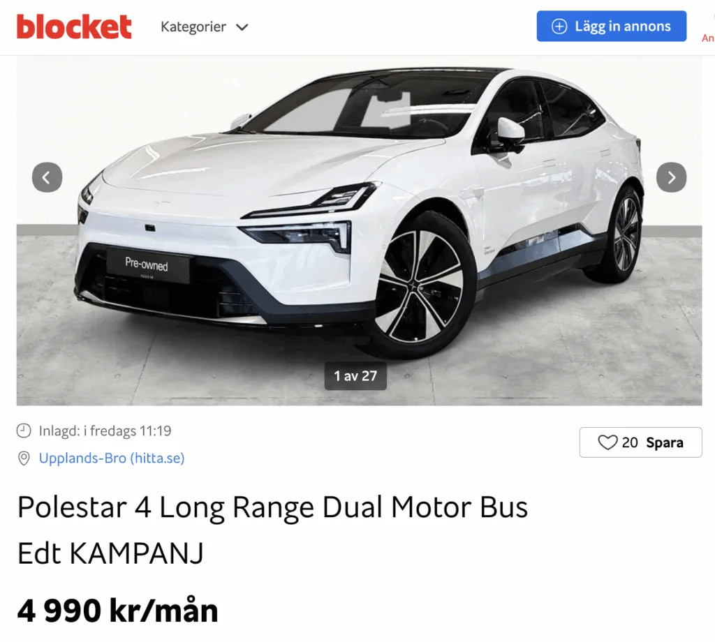 Men just nu går lätt begagnade exemplar av Polestar 4 som bara gått något 100-tal mil att privatleasa för endast 4995 kronor i månaden, uppger Alleasing.se. Sett till leasingfaktorn är det ett av Sveriges bästa erbjudanden på privatleasing just nu. Volvo Car Retail som står bakom erbjudandet på Blocket flaggar dock för att det kan bli dyrare år 2 och 3 då räntan går upp. Men fortfarande lär det bli en enorm besparing jämfört med att köpa elbilen. Service samt fri försäkring första året ingår.