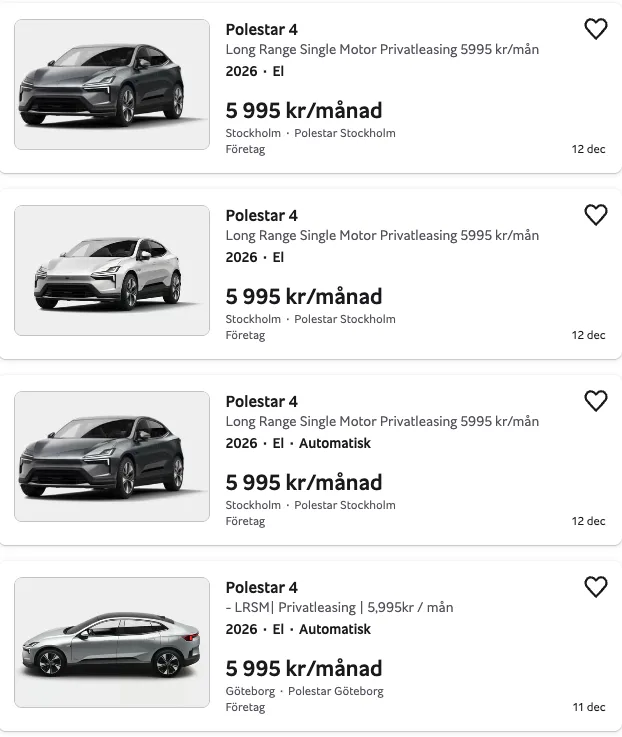 Elbilen kostar annars från 692 000 kronor (pågående kampanj) men nu kan du privatleasa den för en månadskostnad som verkligen sticker ut. Hos flera Polestar-återförsäljare i landet erbjuds Polestar 4 Long Range Single Motor från 5 995 kronor i månaden med lagerbilar för snabb leverans. Upplägget är ofta 36 månader och 4 500 mil, vilket även det sticker ut då privatleasingerbjudanden annars oftast har 1 000 mil per år i körsträcka.
