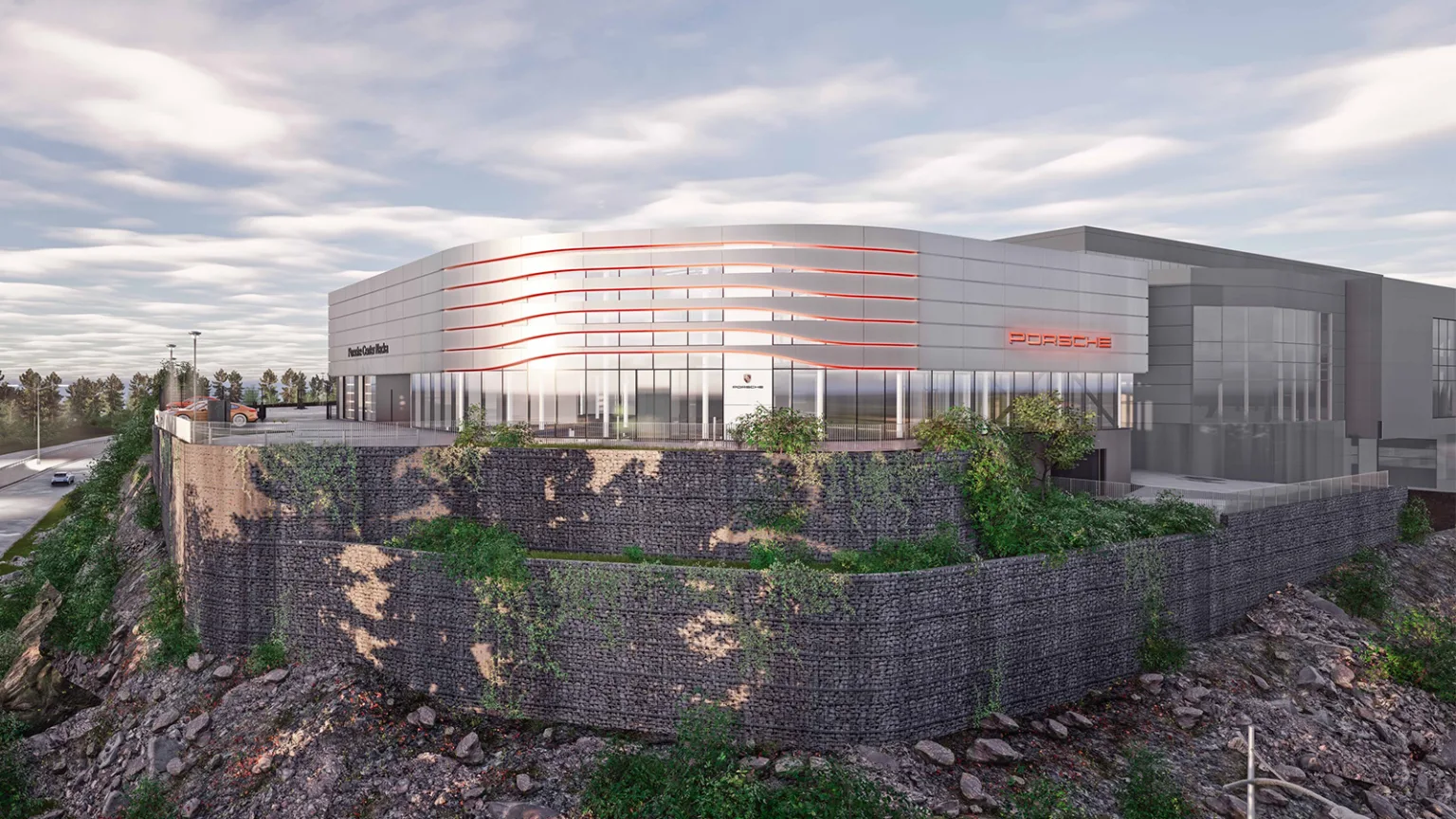 Bakom det nya örnnästet på berget står Din Bil som redan driver flera Porscheanläggningar i Sverige. Den nya hallen i Nacka ska byggas enligt det senaste konceptet Destination Porsche. Det är en modulär design framtagen för att ge en exklusiv produktupplevelse snarare än bara en traditionell bilhall.