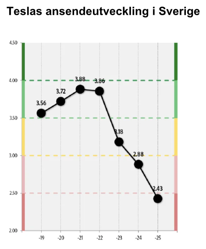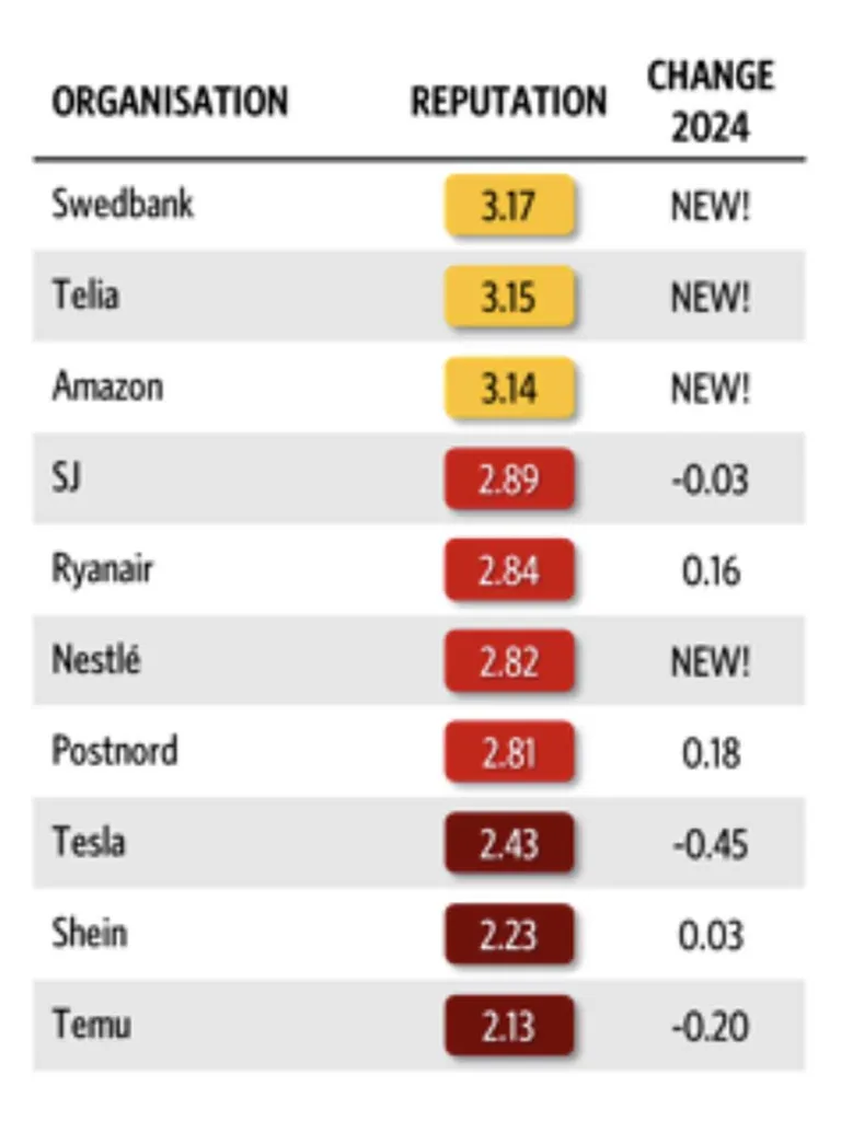 Teslas anseende bland svenska folket rasar till bottennivå. De har nu nästan lika dåligt rykte som Temu och Shein.