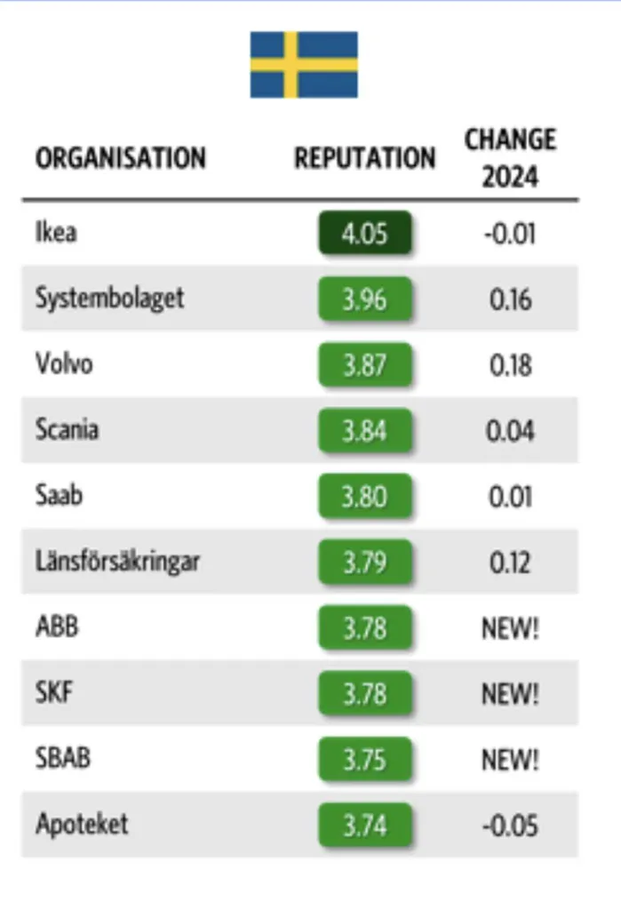 Ikea är Teslas raka motsats och toppar listan över företag med högt anseende i Sverige före Systembolaget, Volvo och Scania.