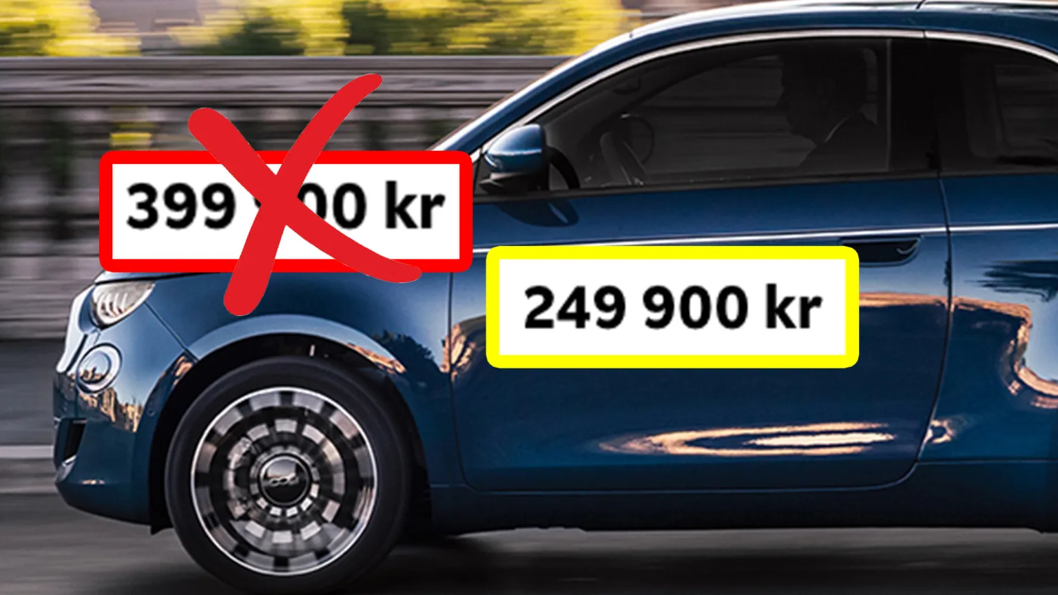 Fiats ikoniska småbil i elversion, med en räckvidd på upp till 320 km och 118 hästkrafter, kostade tidigare 399 900 kronor. I dag kan du köpa en fabriksny bil från 2023 för 250 000 kronor – en värdeminskning på nästan 150 000 kronor.