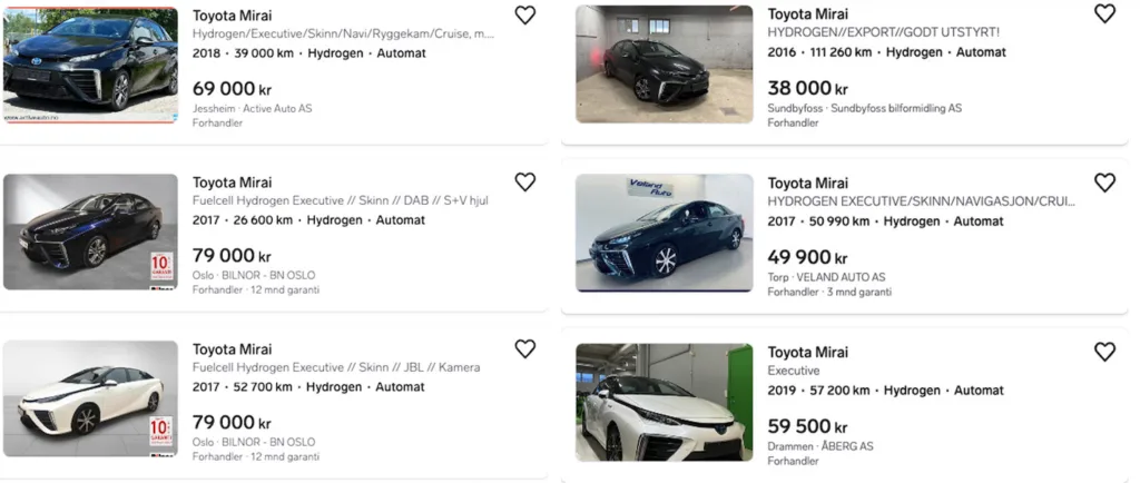 På norska Finn.no (motsvarigheten till svenska Blocket) reas nu vätgasbilar ut. Flera Toyota Mirai ligger runt 50 000 kronor trots att de ofta är välutrustade och har låg körsträcka samt bara är några år gamla. Och vissa är ännu billigare. Ner mot omkring 38 000 kronor för en “äldre” modell som rullat lite mer.