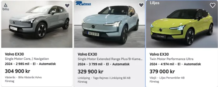 Carups genomgång av av Blocket-annonser bekräftar bilden. Volvo minsta elbil sjunker som en sten i värde. För att se hur stort tappet är i verkligheten har vi analyserat de billigaste EX30-exemplaren som svenska bilhandlare lagt ut på Blocket. Alla bilarna har färre än 4 000 mil på mätaren. Och verkligheten är skrämmande. Många exemplar har tappat över 200 000 kronor på bara ett år.