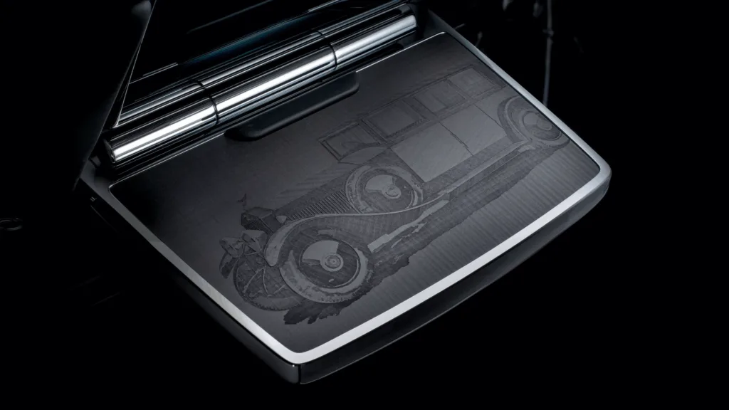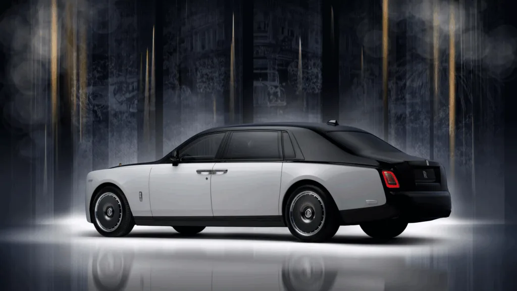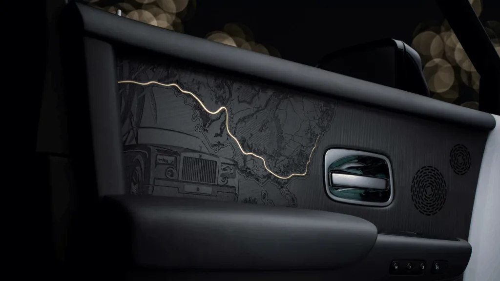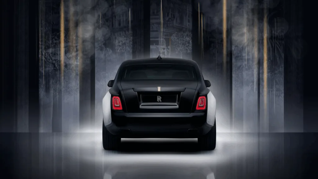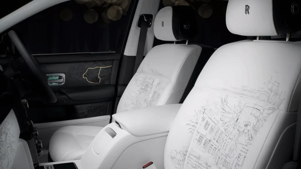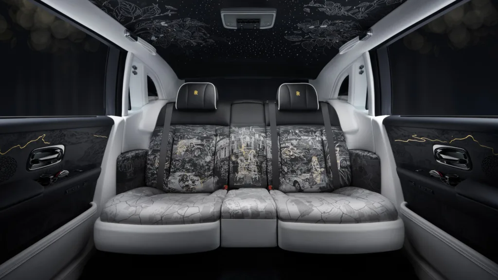 Men även baksätet har förvandlats till en konstnärlig duk, och där berättas Phantoms historia i tre lager. Detta unika konstverk tog över ett år att skapa och innehåller mer än 160 000 stygn. Bakre sätena är klädda i tyg som en hyllning till förr i tiden, då endast framsätena var i läder eftersom de var avsedda för chauffören. Resultatet är en kupé som tillhör historiens mest ambitiösa kollektion.