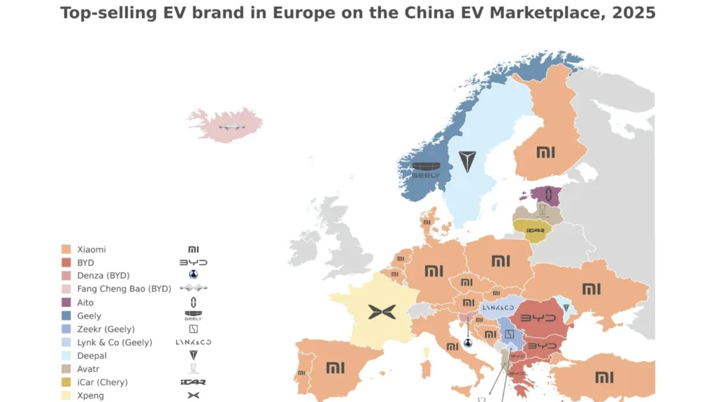 China EV Marketplace är en plattform som fungerar som mellanhand för att importera kinesiska elbilar. Där kan kunder beställa och importera kinesiska bilar. Enligt en rapport från företaget toppade Xiaomi listan som det mest importerade kinesiska elbilsmärket 2025 via direktimport – i flera europeiska länder. Bland annat större länder som Tyskland och Spanien. Men även i 13 andra EU‑länder.