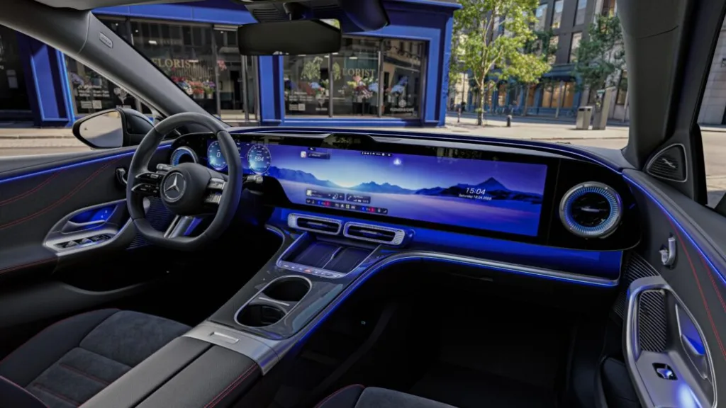 Instrumentpanelen domineras av en stor glaspanel som sträcker sig över hela bredden. Skärmarna är fler och större och passageraren får en egen. Samtidigt satsar Mercedes på komfortdetaljer som massage i stolarna, avancerad ljudanläggning och stämningsbelysning som kan förändra hela kupén. Materialvalen är också mer traditionella med läder, trä och metall. Skillnaden märks tydligt.