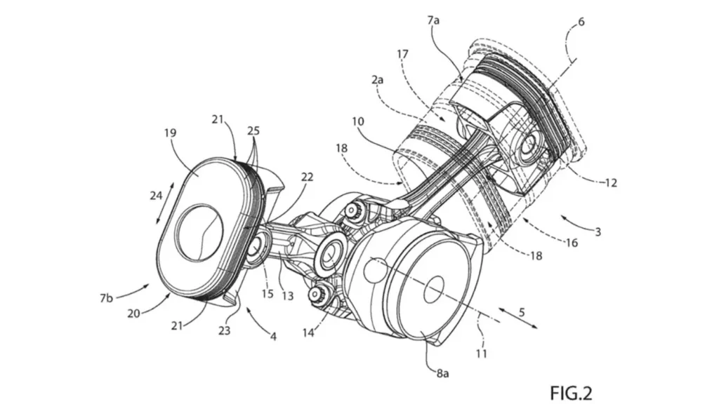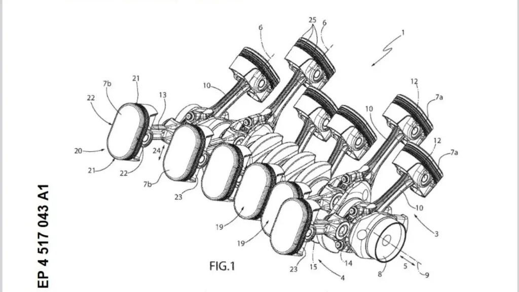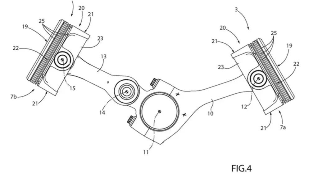 Ferraris patent avslöjar också en ovanlig lösning för vevstakarna. I stället för att varje kolv har sin egen vevstake, sitter kolvarna parvis ihop. Det gör att vevaxeln kan göras ännu kortare än i en traditionell V12.