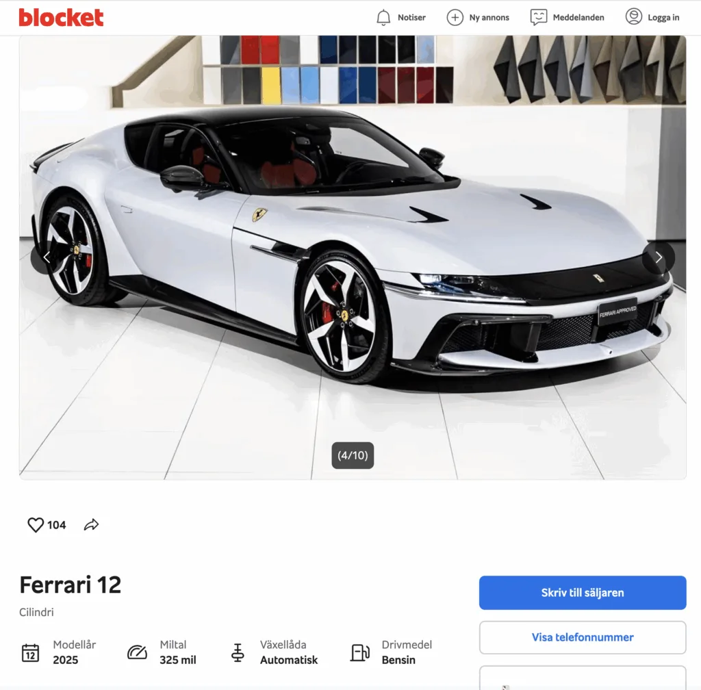 Ferrari 12 Cilindri hade världspremiär i maj. Bilen är en direkt hyllning till V12-motorn. Men den som vill ha bilen får normalt vänta. Ferrari uppger att köpare kan behöva vänta till 2027 för leverans. Men nu finns ett exemplar till salu på Blocket – redo att levereras direkt. Bilen själv av Autoropa. Prislappen ligger på 6,2 miljoner kronor.