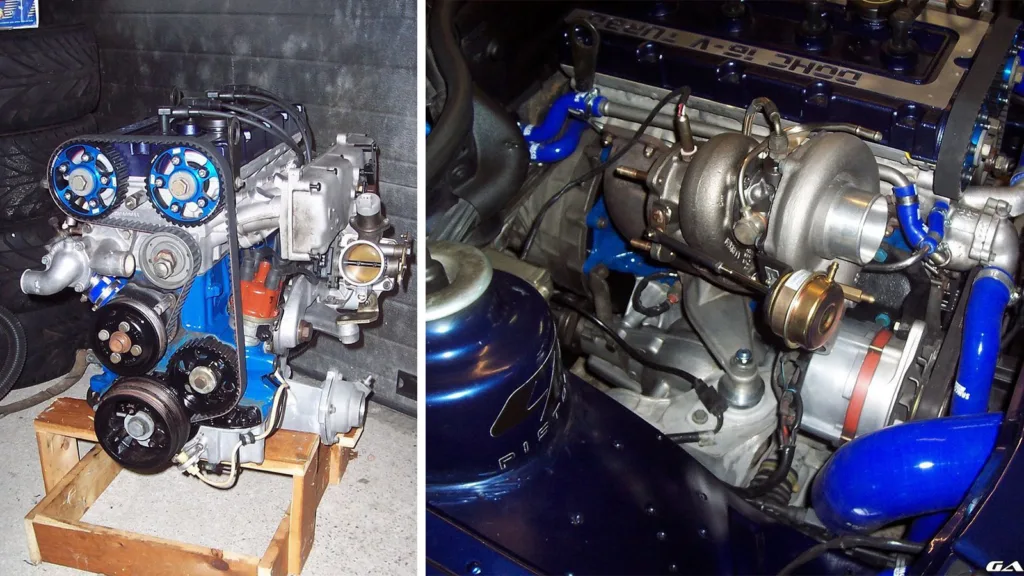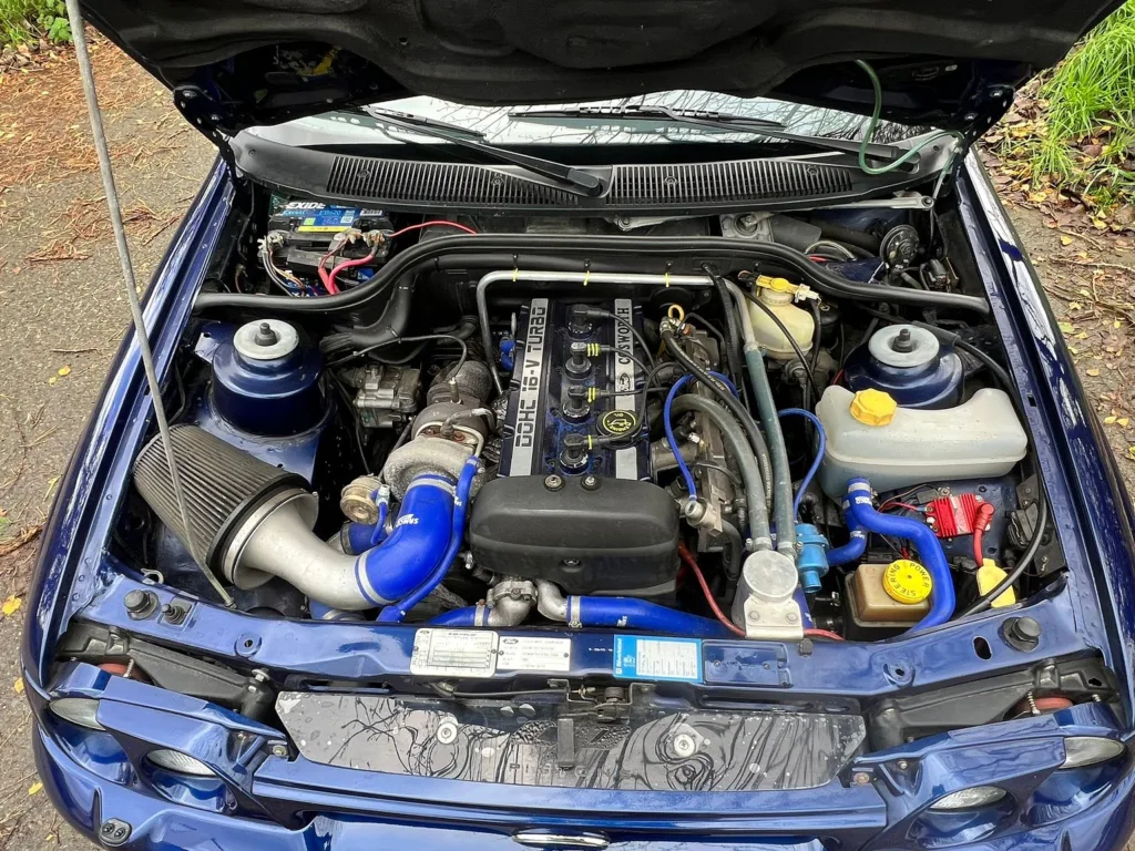 Säljaren anger en lång lista av prestandadelar: hybridturbo från Turbo Technics T38, portat topplock, förstärkta ventilfjädrar, racetopplockspackning, ställbara kamdrev, borrat block, Carillo-kolvar, högtrycksoljepump, ARP-skruvar, lättat svänghjul, större intercooler och uppgraderat bränslesystem.