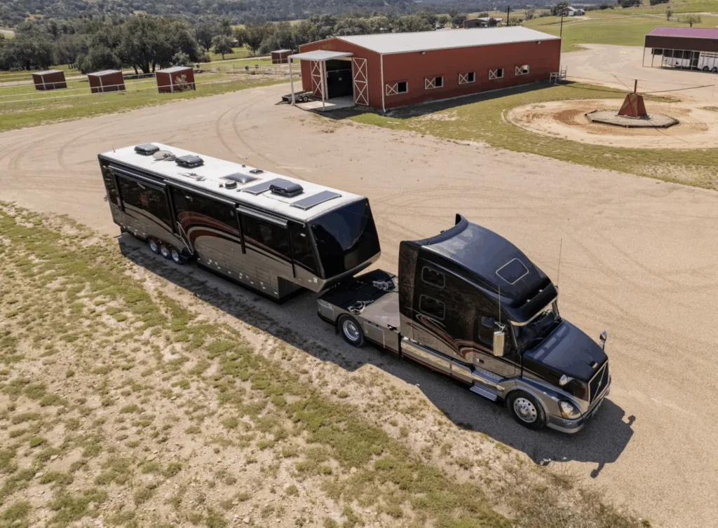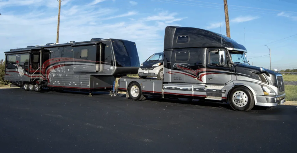 En Volvo-lastbil med 12,8-liters dieselmotor kopplad till en enorm husvagn. Och mitt emellan – en liten bil. Tillsammans med alla finesser får den campinglivet att se lyxigt ut.