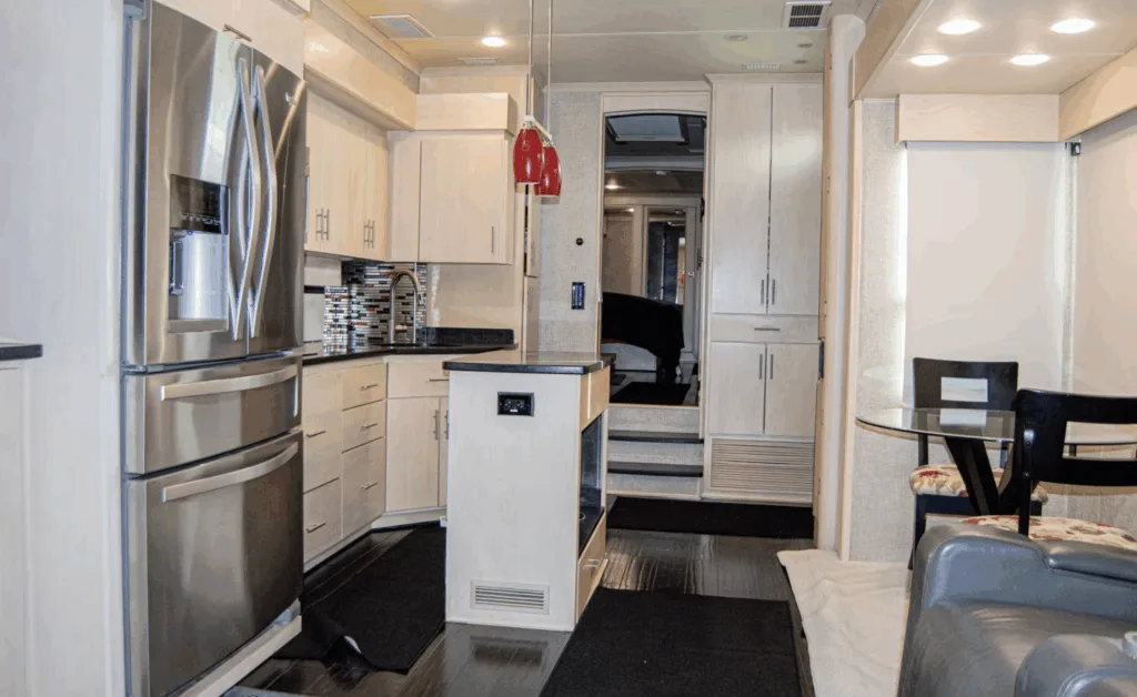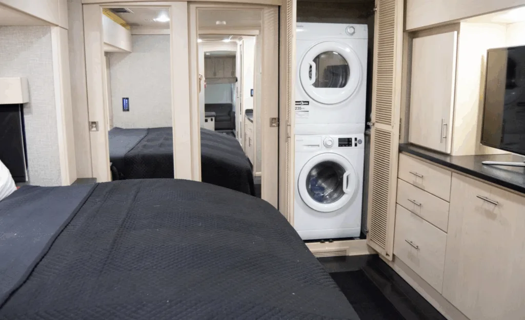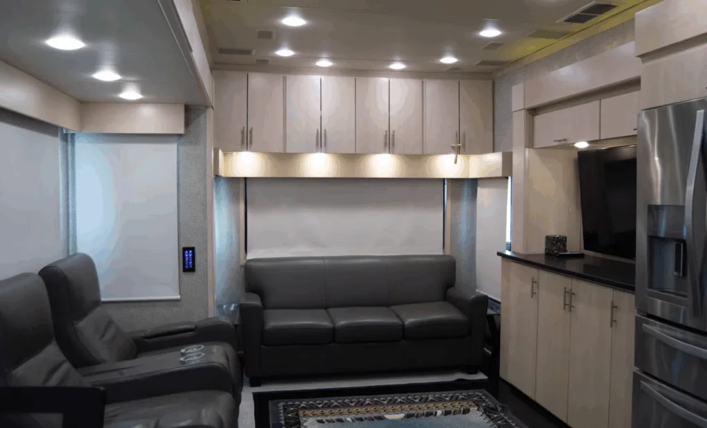 Husvagnen är designad för maximal komfort: en stor dusch, kingsize-säng, lädersoffa som kan bäddas, och elektriska recliners. Alltså att du kan fälla fåtöljerna med elektrisk knapp, perfekt för avkoppling. Vattenförsörjningen imponerar verkligen också. Vattenpumpen klarar hela 76 liter per minut, vilket är ovanligt kraftfullt för en husvagn.