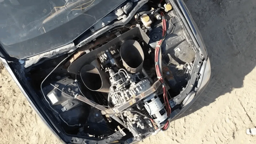 Växellådan fick plats inuti bilen. Teamet skar upp transmissionskanalen, svetsade förstärkningar och bultade fast hela konstverket. Kort därefter kopplades den till en kort drivaxel med två universalled och ett mellanlager. Bränslesystemet flyttades till bagageutrymmet, för säkerhetens skull. Och sedan kom elden.