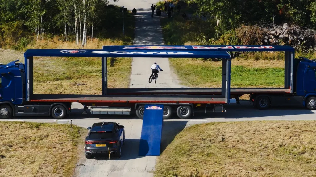 Ett mycket riskfyllt stunt har utförts av Scania och Red Bull. Stuntmannen Matt Jones cyklade på sin mountainbike. Han fick extra fart genom att hålla i ett rep som drogs av en bil. Sedan hoppade han rakt igenom två självkörande Scania-lastbilar.