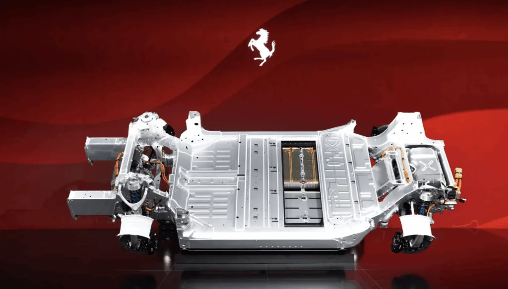 Batteriet är helt integrerat i golven och konstruerade för att ge en så låg tyngdpunkt som möjligt. Enligt Ferrari har den 80 mm lägre tyngdpunkt än en Ferrari med förbränningsmotor. Nya elbilen får också en aktiv fjädring som från början konstruerades för Purosangue och F80. De säger sig ha uppnått en rekordhög energitäthet i batteripaketet, nästan 195 Wh per kg.