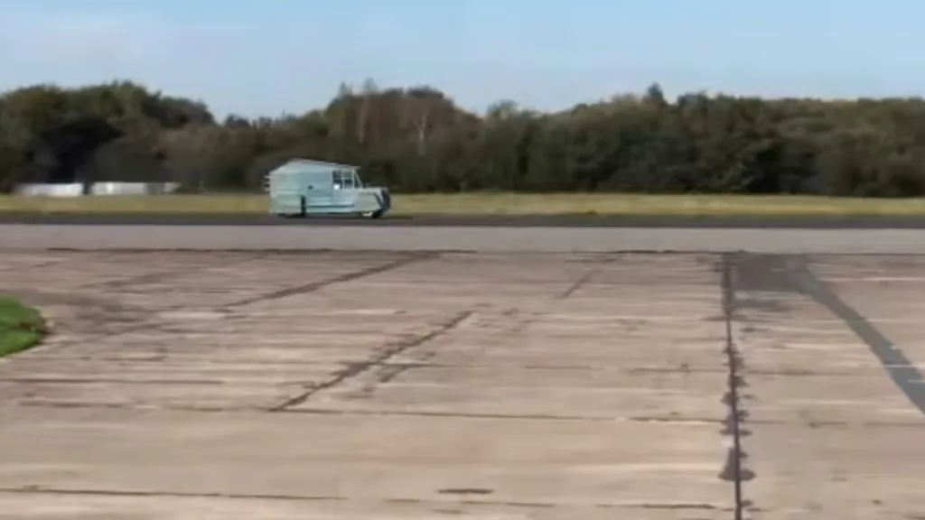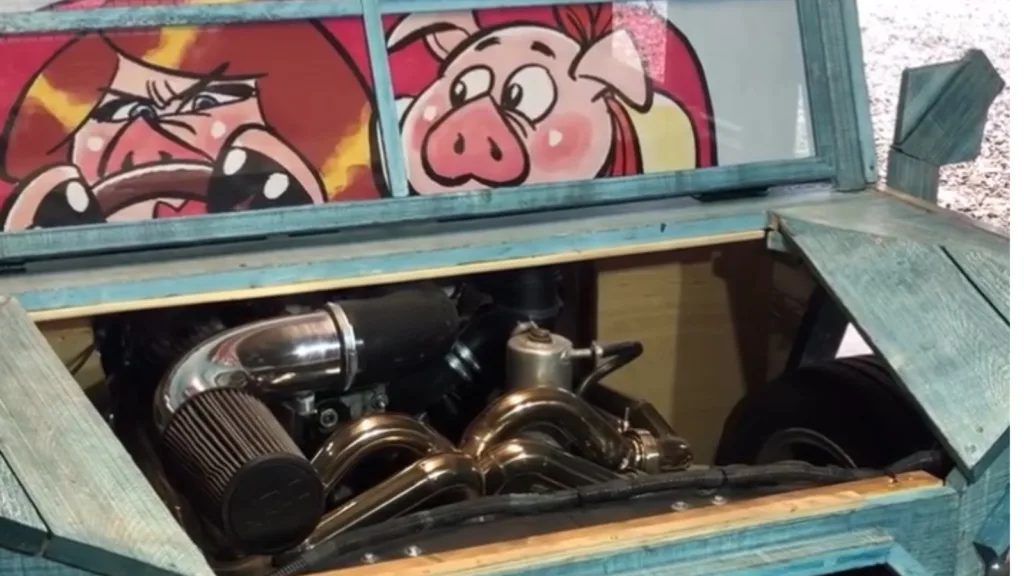 61-årige Brian Cade byggde en kaross till sin galna racer på ett TVR-chassi med en 4,5 liters V8-motor. Bilen fick inspiration av en karaktär från hans egna barnbok “grisäventyret”, som är en twist på klassikern De tre små grisarna. Brian tog sitt världsrekord i lördags – han körde 171 km/h i skjulet.