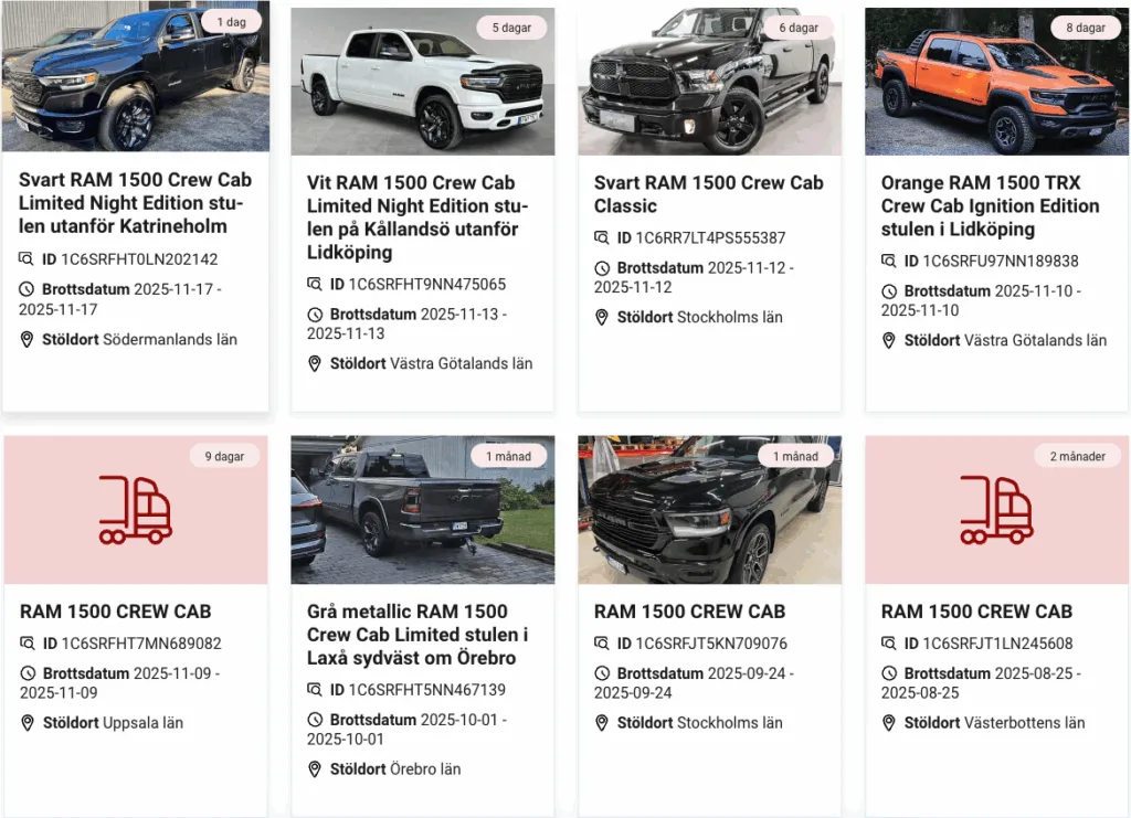 Larmtjänsts siffror är tydliga. Närmare 40 RAM-pickuper har rapporterats stulna hittills i år. Det är en drastisk ökning som nu utlöser en stor polisinsats över hela landet. Polisens misstanke är både konkret och skrämmande. Det är beställningsjobb som går direkt österut – till den ryska armén.