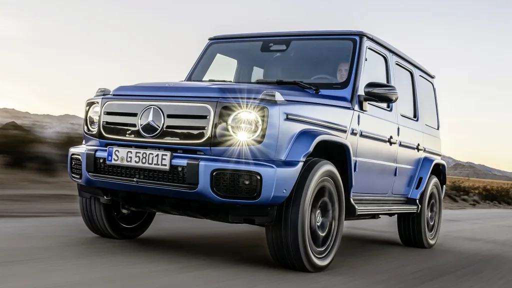 Den elektriska G-klassen bygger vidare på samma ikoniska form men med fyra individuella elmotorer som tillsammans ger 587 hästkrafter. Räckvidden är upp till 47 mil. Trots eldriften behåller modellen sin terrängförmåga med hög markfrigång och avancerad fyrhjulsdrift.