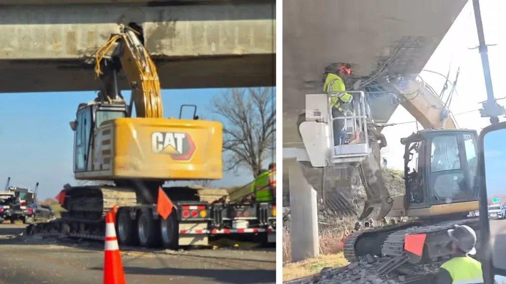 Hela bron måste stängas efter en dramatisk olycka med en grävmaskin. På onsdagen körde en 46-årig man lastbil. Han hade en 25 ton tung Caterpillar 323-grävmaskin på ett släp. Då körde mannen rakt in i bron. Grävmaskinens arm slet upp både brodäcket och stack till och med upp i vägbanan ovanför. Händelsen skedde i Kansas, USA. Nu stängs bron av på obestämd tid.