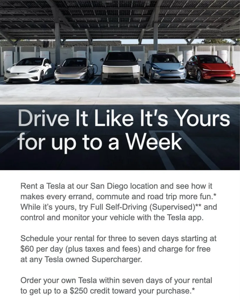 – Hyr en Tesla och se hur den gör varje ärende, pendling och bilresa roligare. Medan den är din kan du prova Full Self-Driving (Supervised) och kontrollera och övervaka ditt fordon med Tesla-appen. Boka din hyrbil i tre till sju dagar från 60 dollar per dag (plus skatter och avgifter) och ladda gratis vid valfri Tesla-ägd Supercharger, uppger Tesla i mejl om nya tjänsten som i startskedet lanseras bland annat i San Diego och Costa Mesa i Kalifornien.