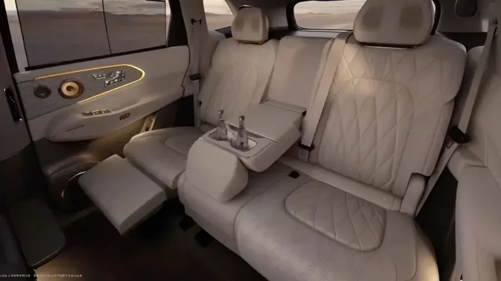 Inuti beskrivs bilen som en ”total teknikfest”. Den har dörrar som öppnas och stängs automatiskt, massagestolar och generöst med pekskärmar. Och i baksätet finns en 17-tums skärm som fälls ner från taket. Till det får man ett lyxigt ljudsystem från Naim. Det är samma varumärke som används i Bentleys bilar.
