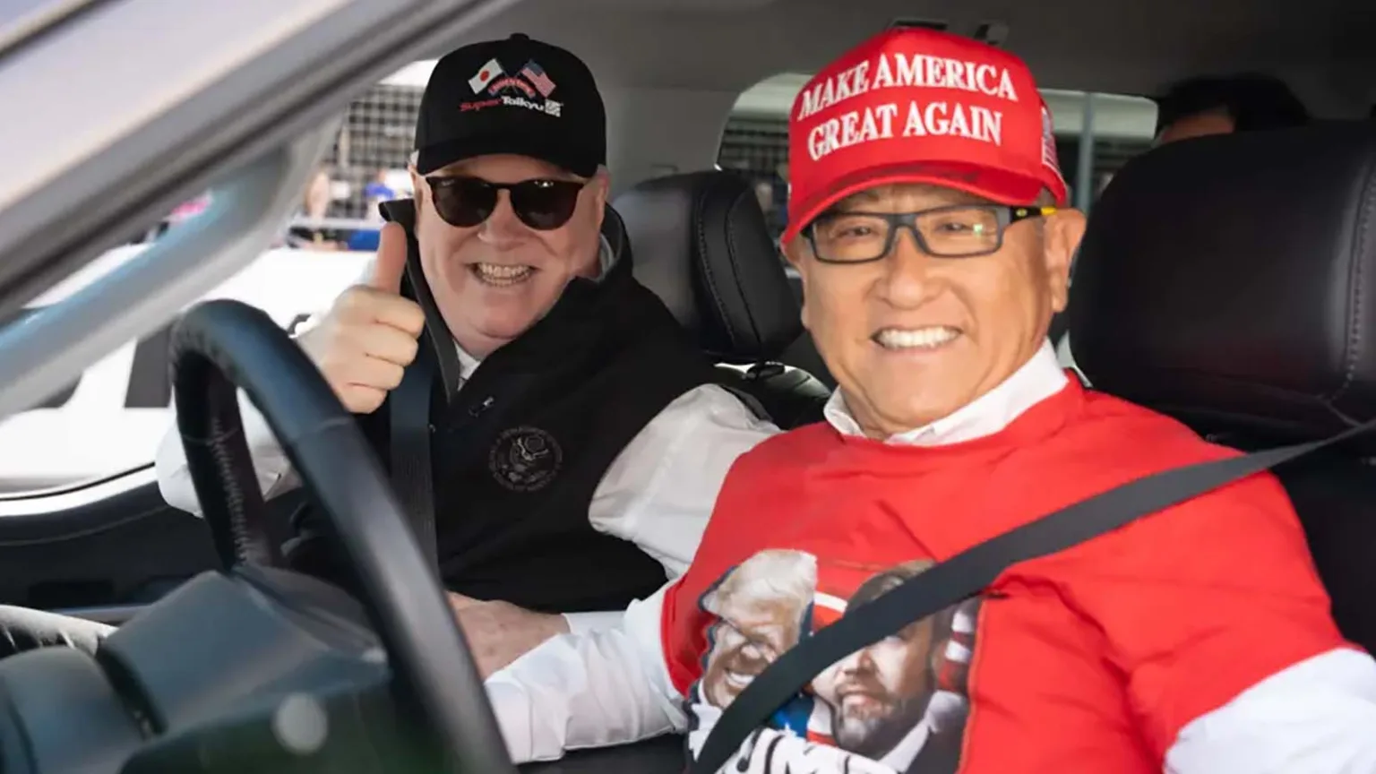 Toyotas starke man hyllar Donald Trump. Akio Toyoda dök upp i Make America Great Again-kläder på Fuji Speedway.