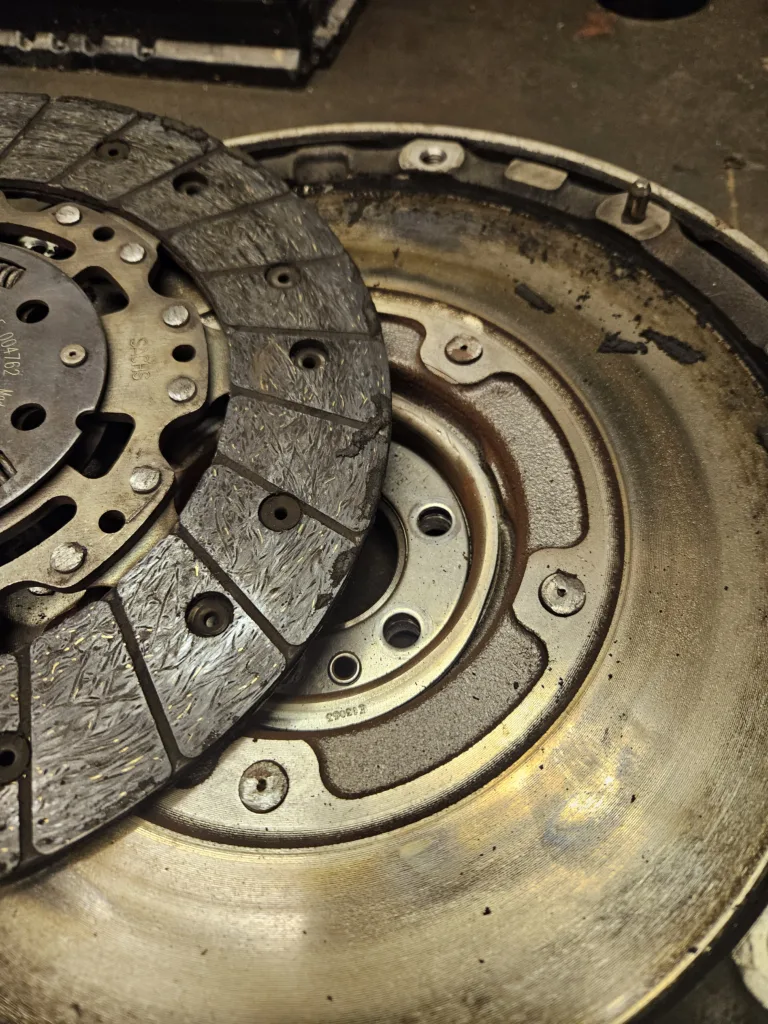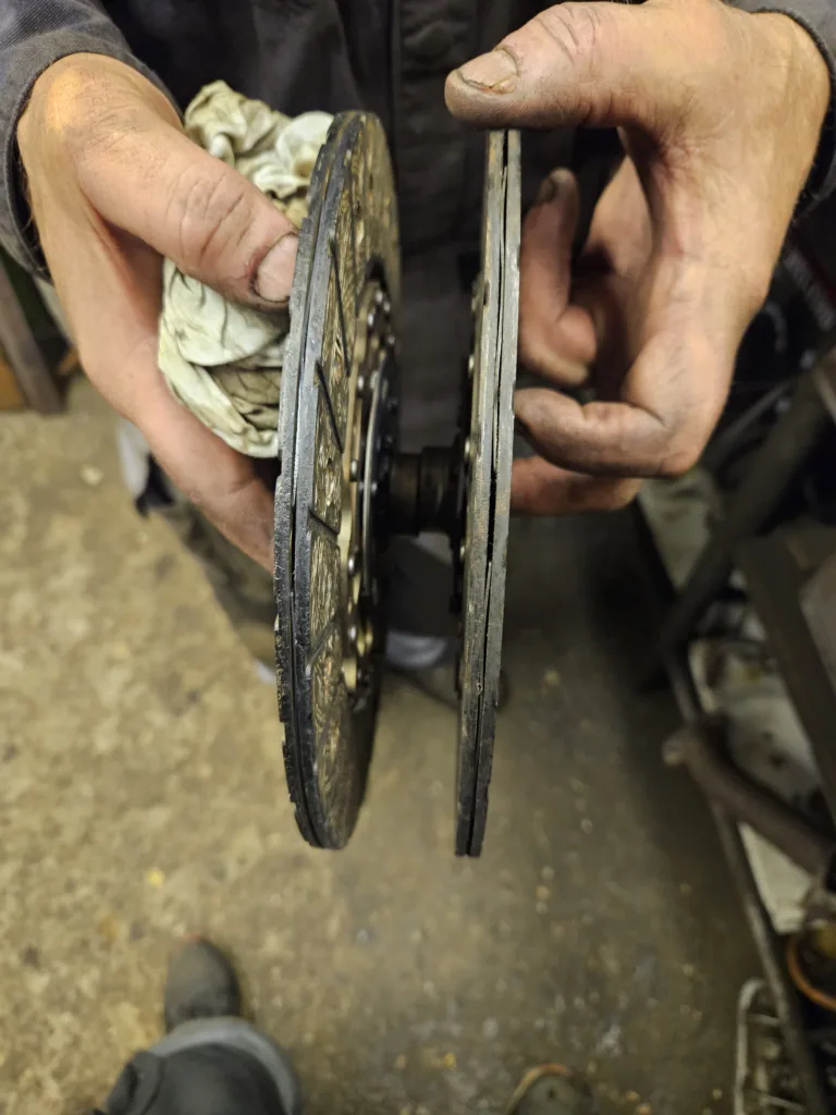 På en av bilderna syns nitar på lamellens baksida som har börjat ta i svänghjulet. De nitarna ska aldrig ens vara på samma sida. Det var först när belägget nötts ner så pass att nitarna började mötas som kopplingen började slira.