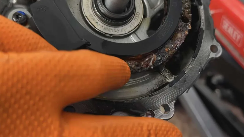 Inträngningen av kylvätska har fått elmotorns lager att haverera.