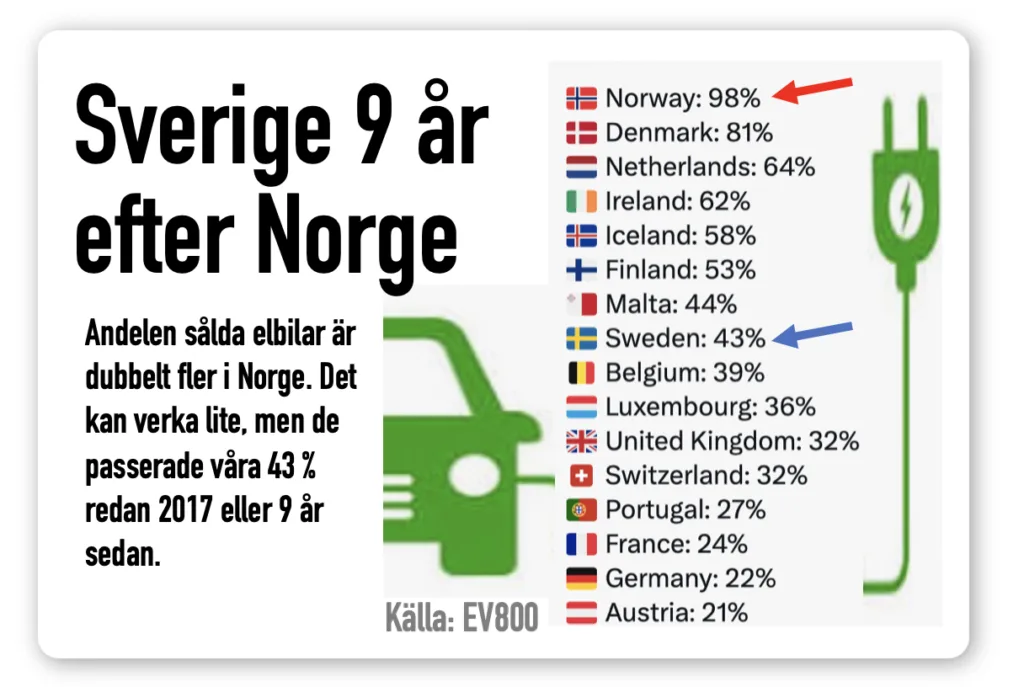 – I Norge rullar 98 % av alla nya bilar på el. Danskar är tvåa på 81 % och irländarna på 62 %, medan Sverige bara har nått 43 %. Norrmännen är en liten bit före oss svenskar, kan vi tänka. Historiken är obönhörlig: Norge ligger väldigt långt före oss. De passerade vår svenska nivå redan år 2017.