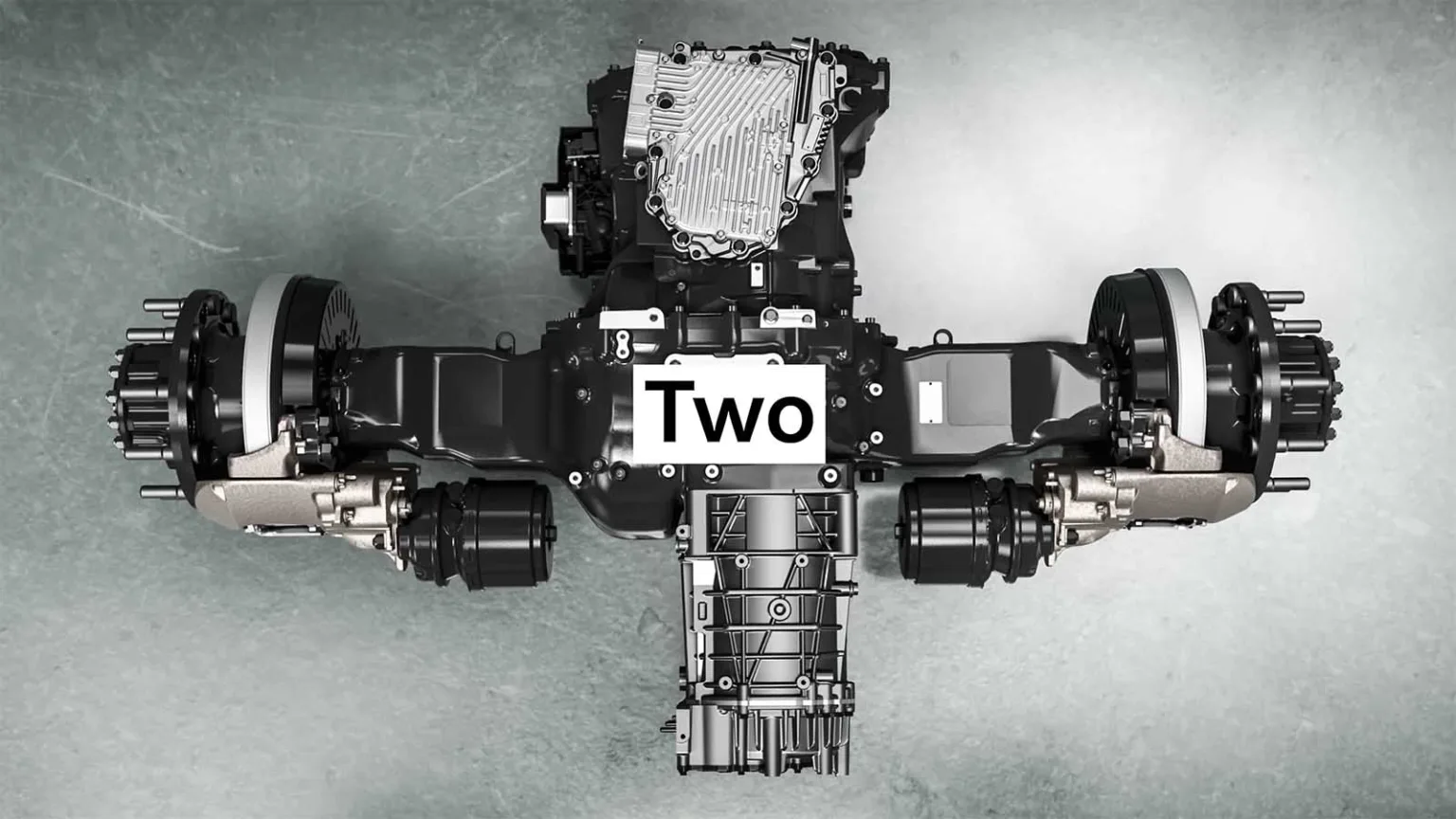 | Nyckelfunktion | Kompakt e-axel med integrerade dubbla elmotorer och sexstegad växellåda i bakaxeln, vilket frigör chassiutrymme för fler batterier |