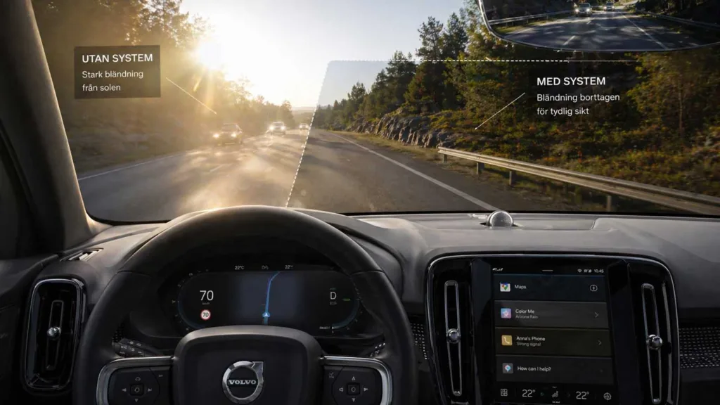 När bländningspunkten är identifierad aktiveras vad Volvo kallar en ”antibländningsenhet”. Det handlar om en switchbar fönsterfilm eller ett smart glas integrerat i rutan. Istället för att mörklägga hela rutan, skapas en liten, mörk punkt precis där solen stör.